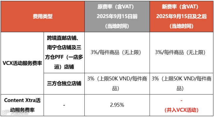 值得注意的是,系统将自动为原 Content Xtra 活动参与卖家办理退出手续,若卖家希望继续享有原 Content Xtra 的相关权益,需自行通过中国卖家中心主动报名 VCX 活动。(注:Content Xtra 活动是越南站点针对 Shopee Live(Shopee 直播)和 Shopee Video(Shopee 短视频)推出的专属服务套餐,买家可在店铺直播间、短视频页面领取直播 / 短视频专属高额优惠券及无门槛优惠券,购买相关商品时最高可享 5 折优惠,旨在吸引消费者通过直播或短视频下单,提升店铺销售额。)此外,新费率仅适用于 2025 年 9 月 15 日(当地时间)后生成的订单,货币单位均为越南盾(VND),且调整内容适用于跨境直邮、本地化履约(南宁仓和三方仓)及一店多运(PFF)店铺。