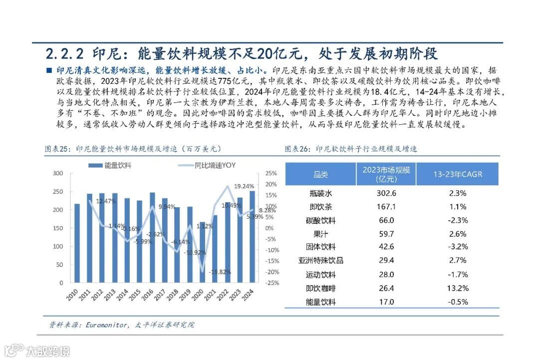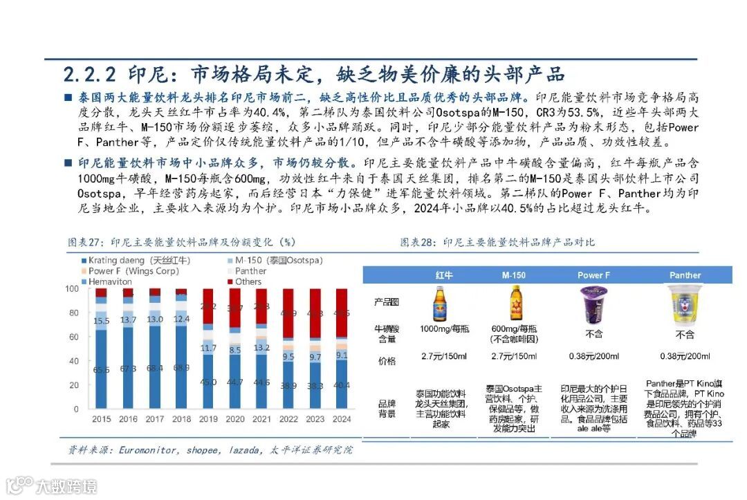 印尼软饮市场规模最大,但能量饮料渗透率低、增长放缓,主因伊斯兰文化影响下的“低加班”生活方式导致咖啡因需求较弱。当前市场尚未定型,缺乏主导性平价产品。红牛与M-150虽位列前二,但份额持续下滑,众多中小品牌活跃。