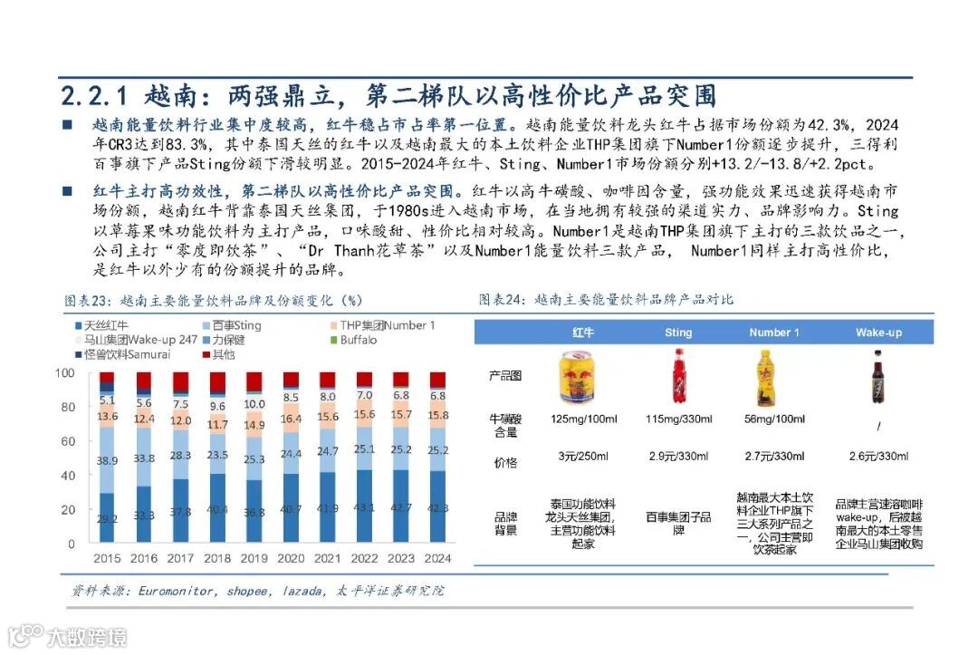 越南市场发展迅猛,2024年行业规模达107.5亿元。红牛凭借品牌与渠道优势居龙头地位,第二梯队Sting和Number1通过差异化策略抢占份额:Sting主打草莓果味,口感酸甜、性价比高;Number1以2.7元/330ml定价和PET瓶装形式,成功实现高性价比突围。