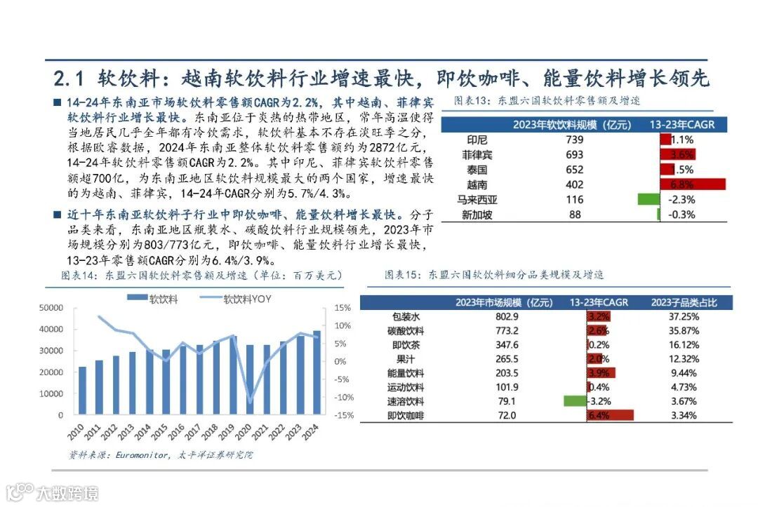 2023年东盟六国零售规模达6285亿美元,人均可支配收入持续增长,越南增速领先。消费能力提升为能量饮料市场扩张提供经济支撑,尤其在劳动密集型产业快速发展的背景下,制造业与服务业人群对功能性饮品需求广泛。