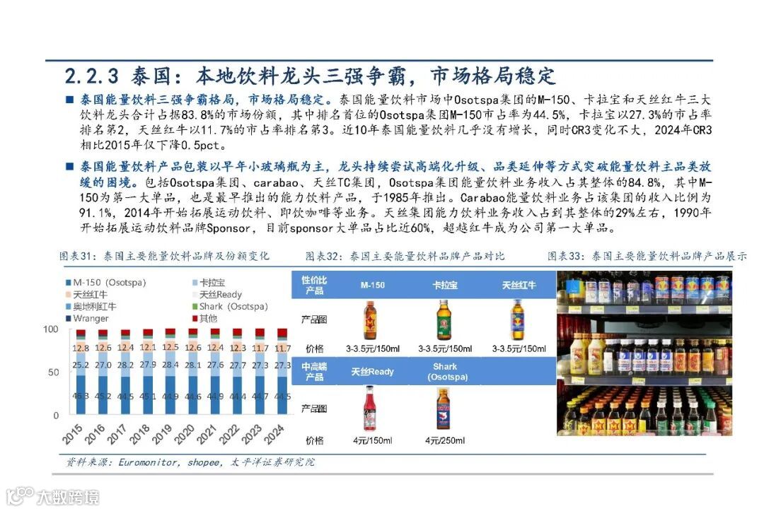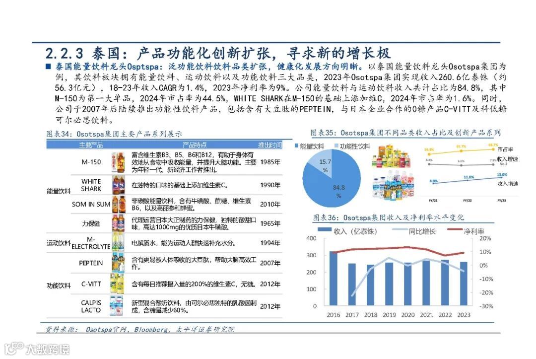 泰国市场趋于饱和,竞争格局稳定。M-150、卡拉宝与天丝红牛三大品牌主导市场。Osotspa集团通过产品创新推动多元化,推出含大豆肽的PEPTEIN、0糖C-VITT等功能性新品,巩固市场地位。