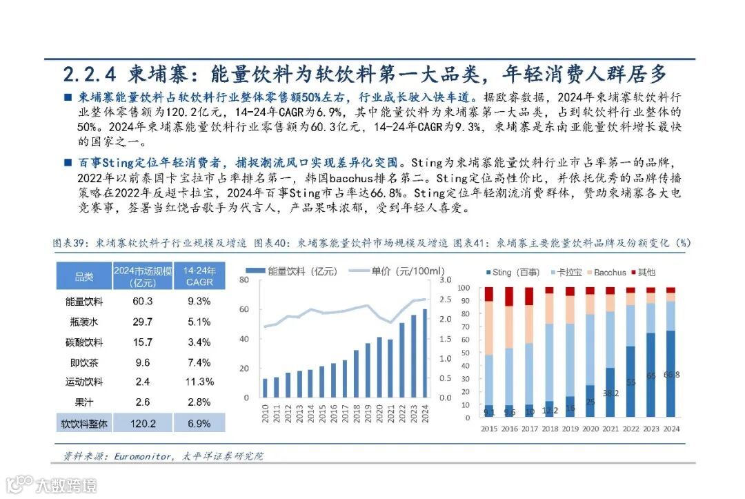 柬埔寨为增长最快市场之一,2024年零售额达60.3亿元。百事旗下Sting占据领先地位,通过赞助电竞赛事、签约当红说唱歌手等方式精准触达年轻消费者,凭借果味浓郁、价格亲民的产品赢得青睐。