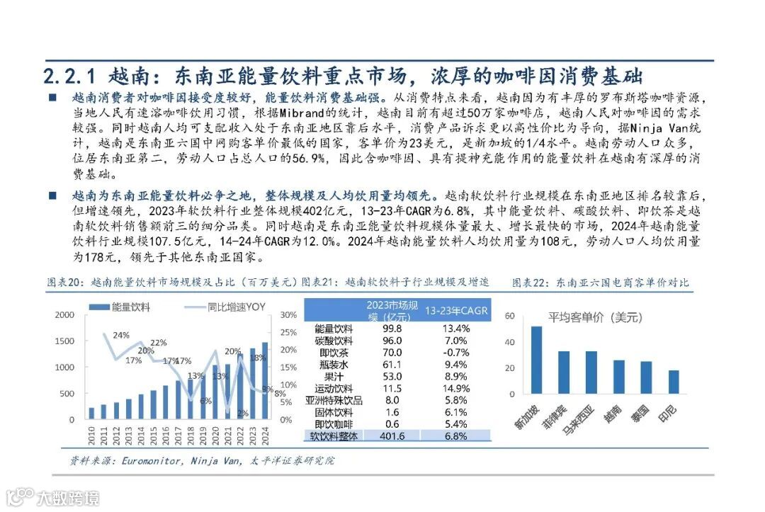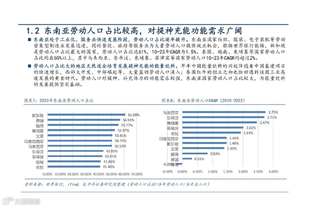 东南亚地区总人口达6.1亿,年龄中位数约30岁,年轻人口占比高,形成能量饮料消费的坚实基础。该群体对提神功能需求旺盛,且随着消费升级,更倾向于选择高品质、高性价比产品。