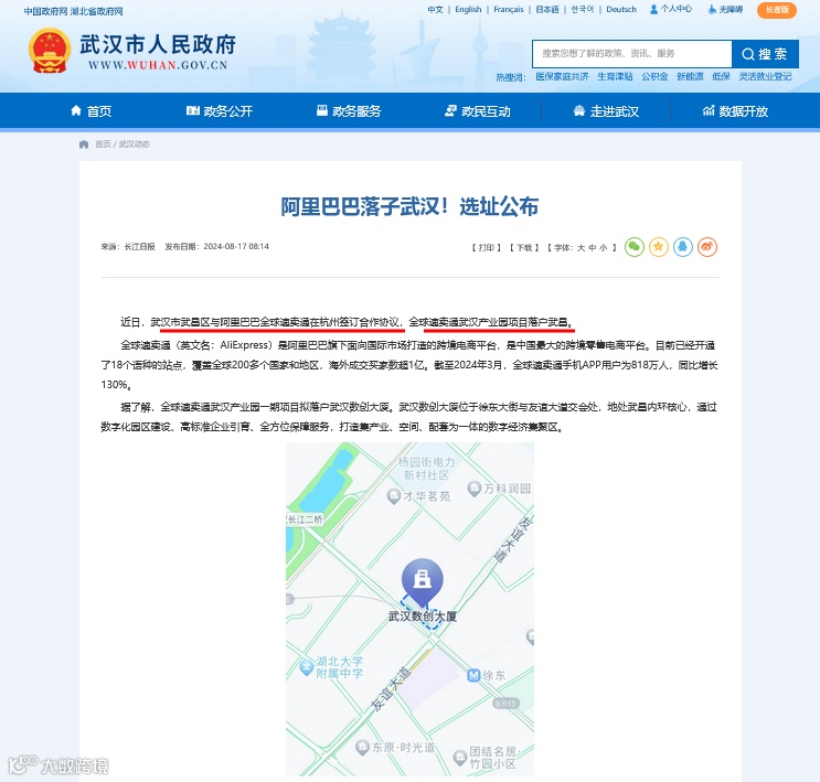 阿里巴巴全球速卖通武汉产业园:2024年2月,阿里巴巴全球速卖通(武汉)跨境电商产业园正式开园,成为速卖通在华中地区的首个跨境电商产业园项目。2024年,武汉企业在速卖通上总销售额超过30亿元人民币,年GMV超过100万人民币的武汉新锐企业超过1000家。