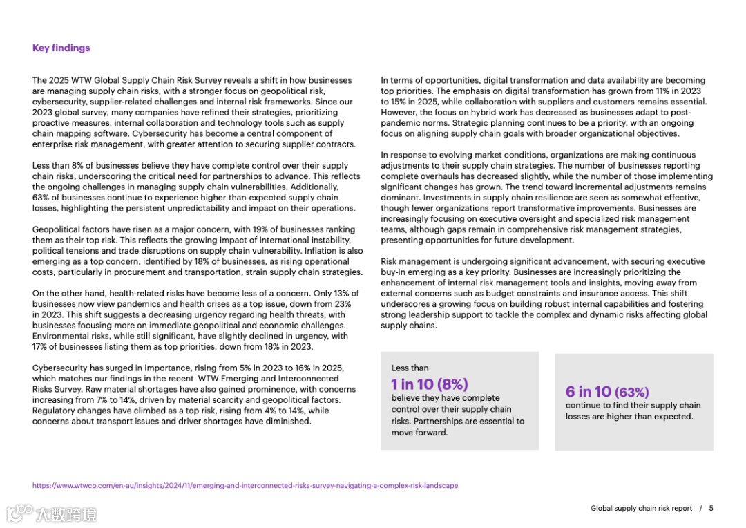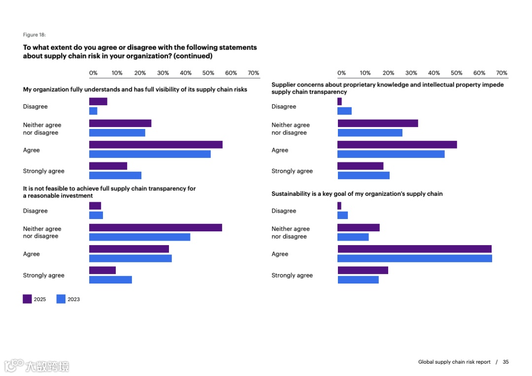 为应对这一系列变化,企业的风险管理策略正从成本驱动转向韧性优先。对离岸外包(Offshoring)的依赖度从26%降至15%,显示出全球化布局的回撤。取而代之的是对改善数据质量与共享(从43%增至58%)以及深化供应商关系(从54%增至60%)的战略倾斜,凸显了以数据驱动和协同合作为核心的供应链韧性建设思路。