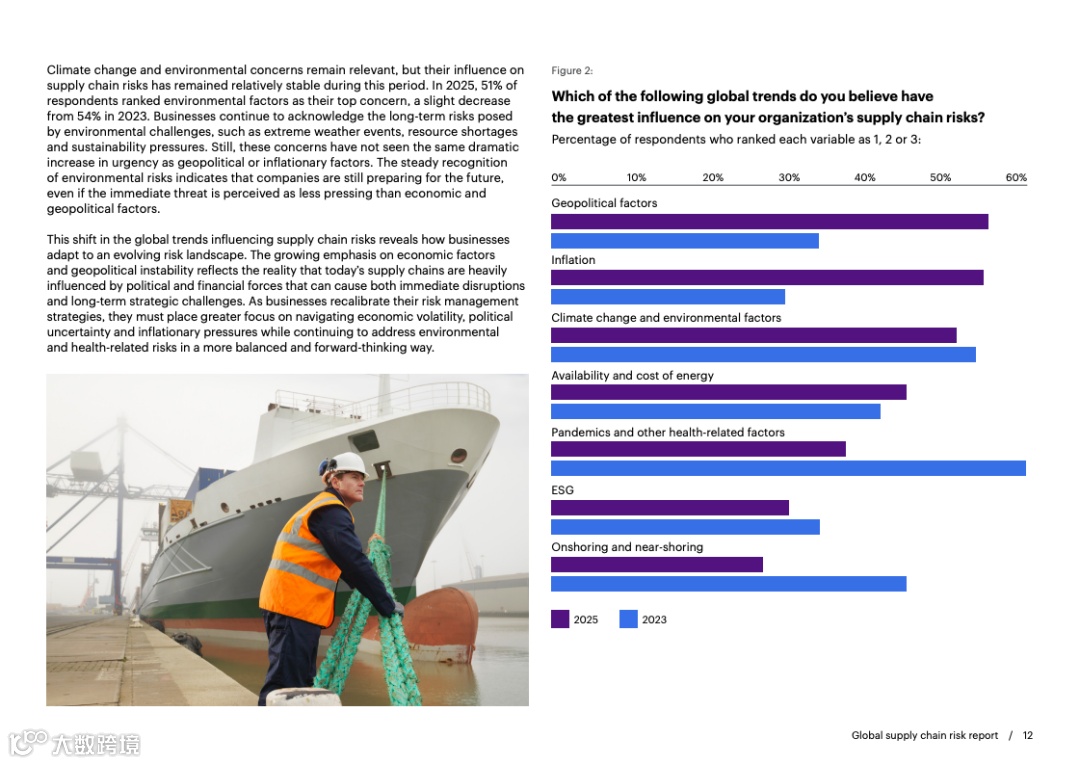 风险优先级的转变尤为显著。将地缘政治列为首要关切的企业比例从2023年的35%激增至2025年的55%。通货膨胀的关注度也从31%同步攀升至55%。与此形成鲜明对比的是,对大流行病等健康相关风险的担忧则从60%大幅回落至37%,表明市场已逐渐适应后疫情时代的常态,并将注意力投向更为紧迫的宏观经济与政治风险。