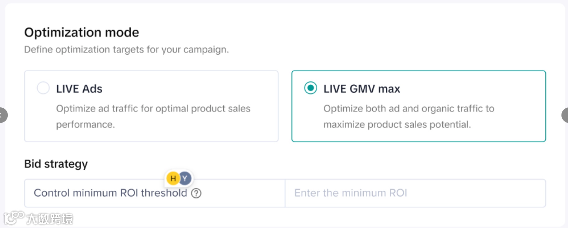在优化模式设置中,选定“LIVE GMV Max”选项