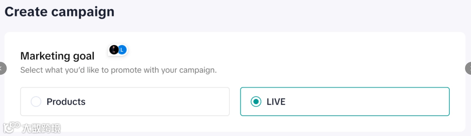 在营销目标选项中,选择“直播”类型