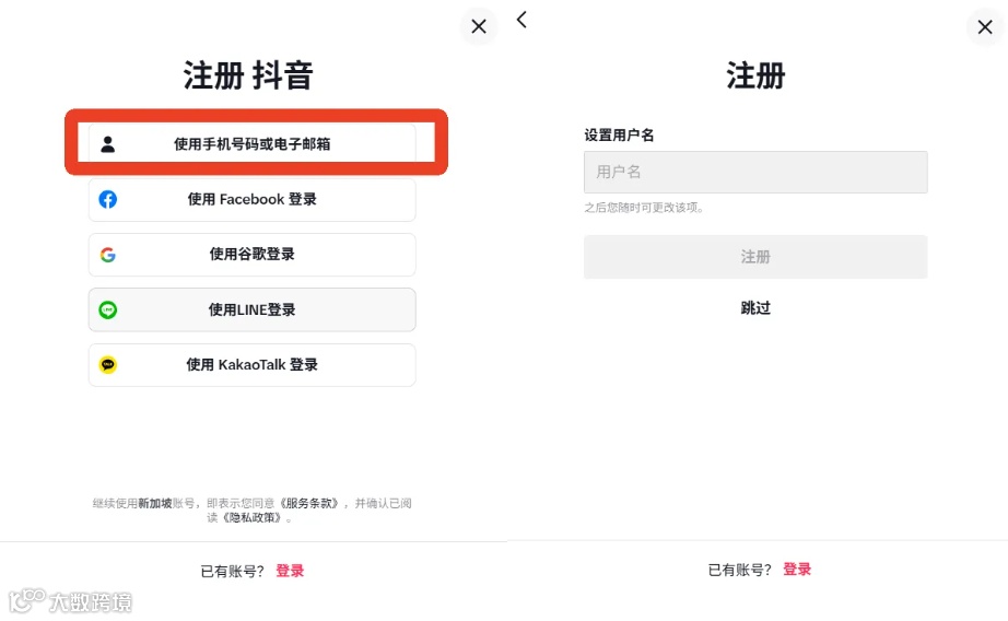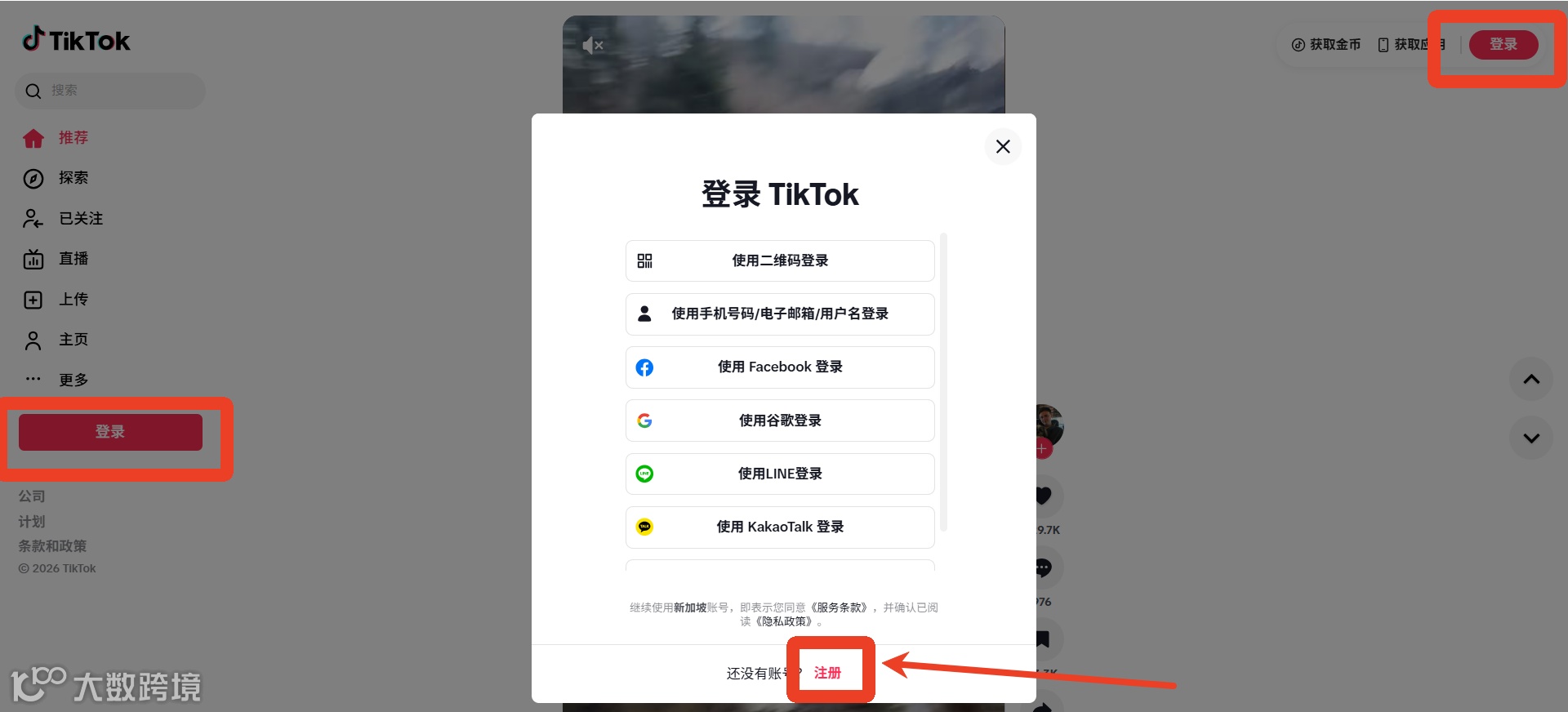④ 在环境中打开 TK 官网(tiktok.com),点击 [登录] → [注册]