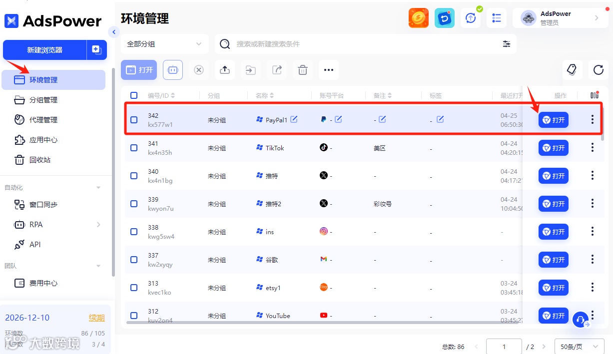 ③ 来到 [环境管理],找到刚才创建的环境,点击 [打开]
