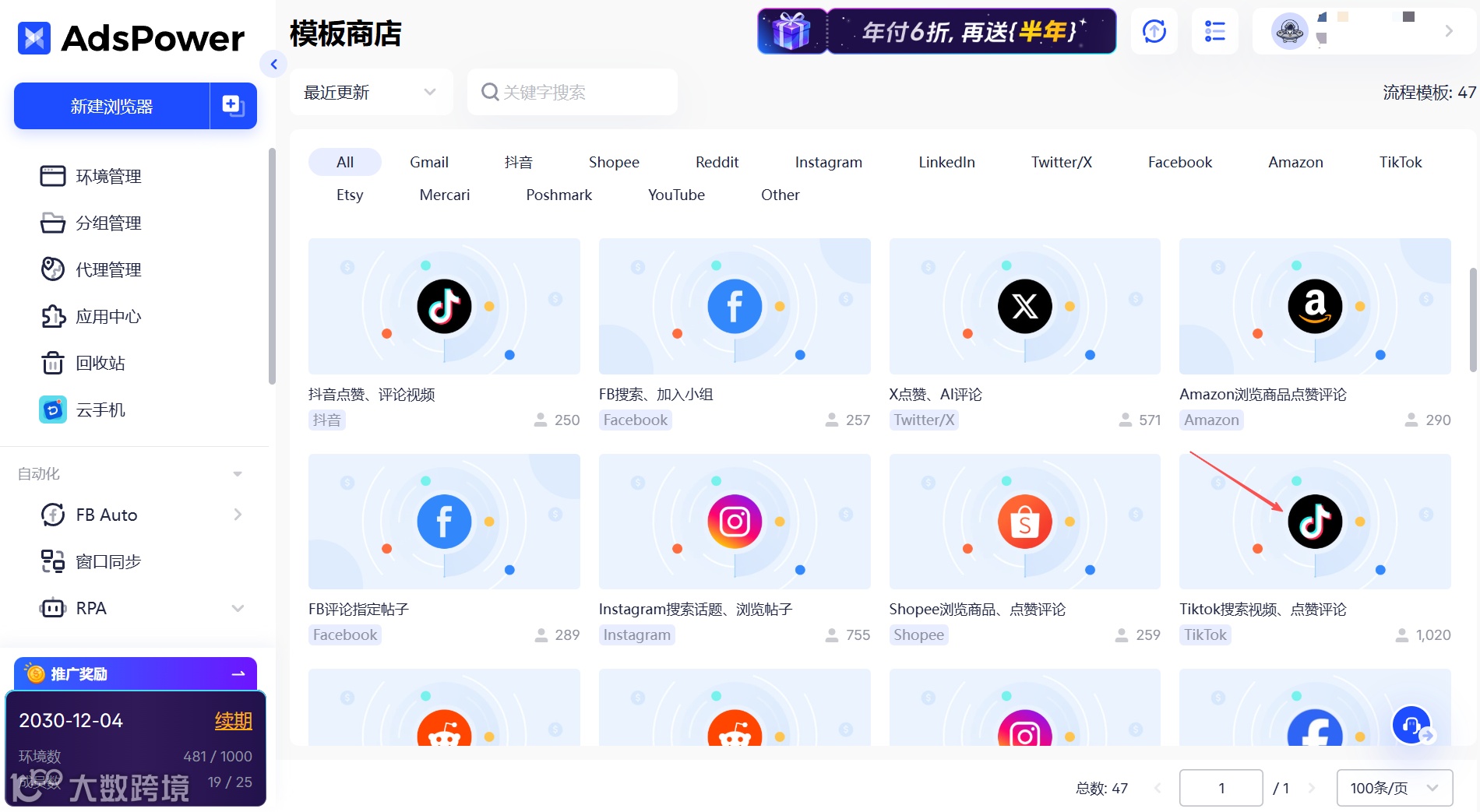 AdsPower 的 RPA 自动化模板可模拟真人行为,如随机浏览、合理停留、少量互动,帮助账号形成自然使用记录,为后续运营铺路。