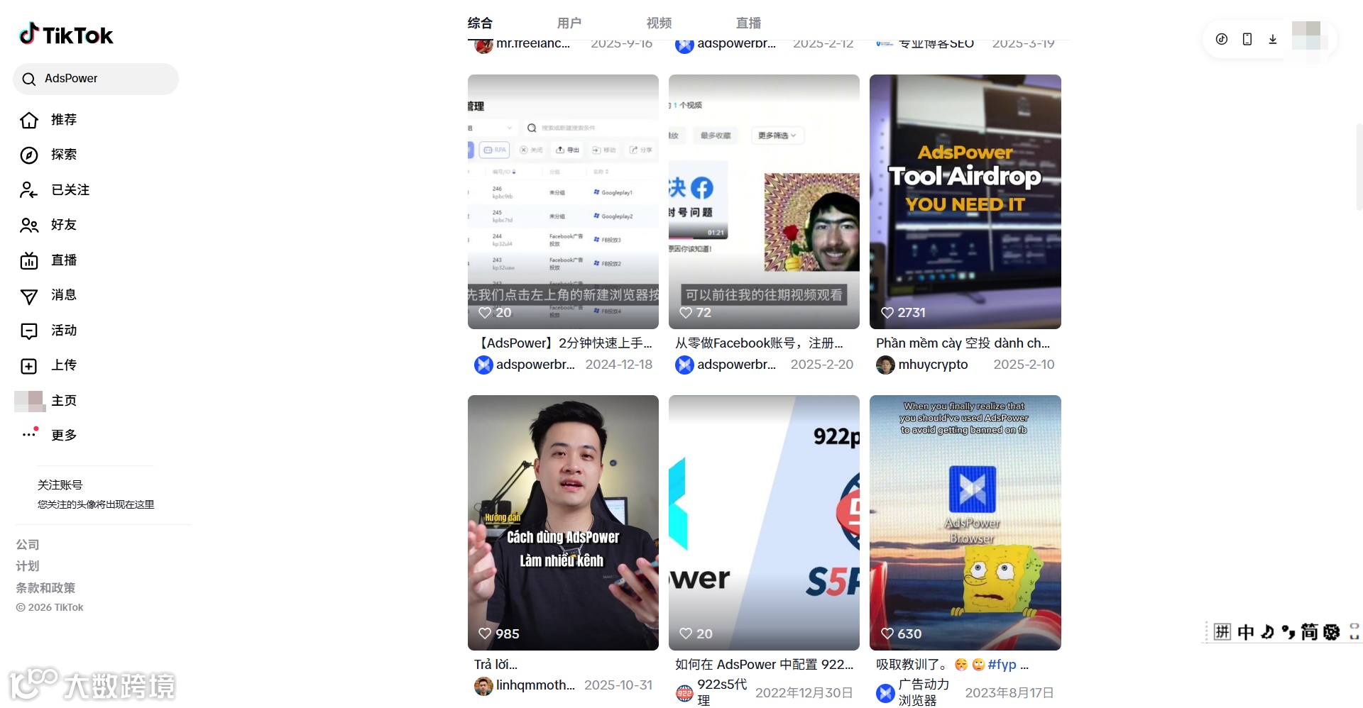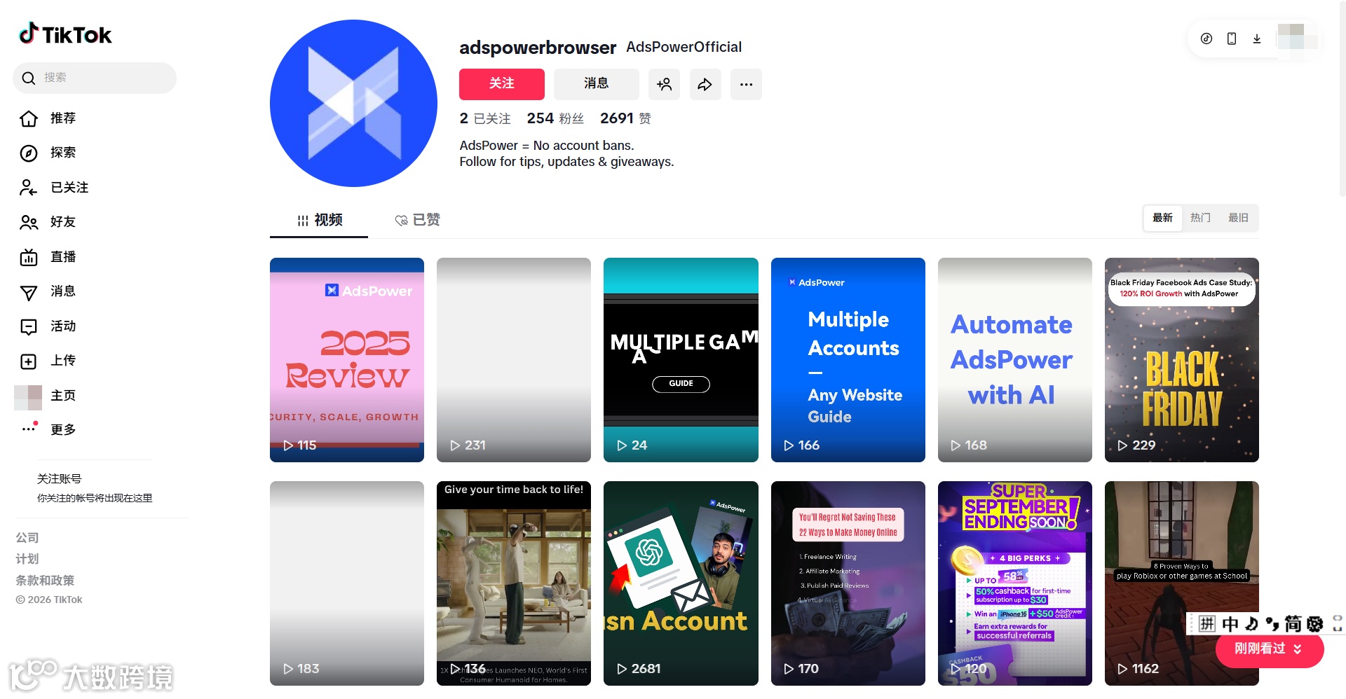 多 TikTok 账号运营时,浏览、互动等重复基础操作耗时易错。AdsPower 的窗口同步功能,可在各账号独立环境下同步执行操作,适配新号统一养号、多账号流程测试、团队协作减重复操作等场景,既保障环境隔离,又大幅提升运营效率。