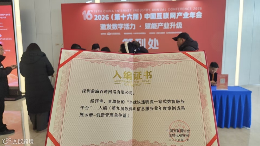 2026年1月7日,由中国互联网协会主办的2026(第十六届)中国互联网产业年会在北京召开。本届年会以“激发数字活力·赋能产业升级”为主题,汇聚政府主管部门、行业专家及企业代表,共探行业发展新趋势。快递100凭借在快递物流领域的持续深耕,获评“全球快递物流一站式数智服务平台”,并入编《2025软件和信息服务业年度·创新管理单位》。