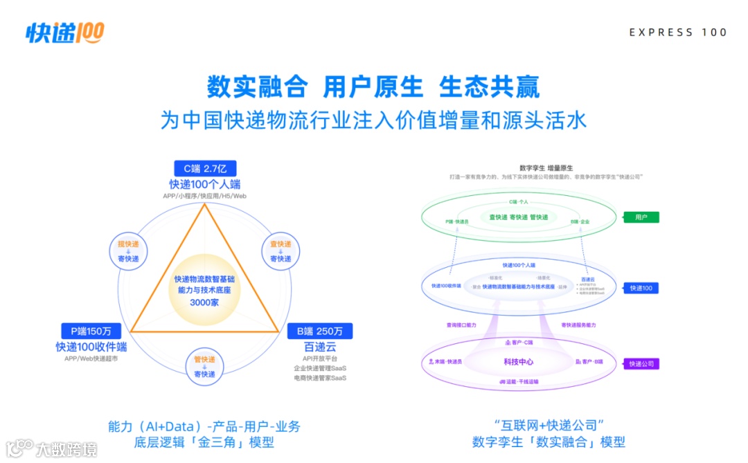 践行“All in one”聚合理念——整合全部快递公司与服务至统一平台,免去多平台切换之扰。“100”既象征覆盖全球快递物流全场景,亦寓意100%用户满意度承诺。快递100构建“1+3”产品体系:1个「快递物流数智基础能力与技术底座」,叠加C端、P端、B端三端协同产品,打通“能力—场景—产品—用户—业务”底层逻辑与内生增长机制。