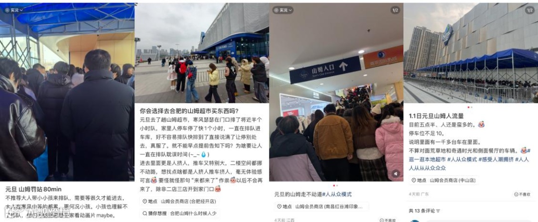 这样的场景在全国山姆门店同步上演:南京排队超80分钟,合肥进车库需半小时,中山停车场停满上千台车,大连山姆排队45分钟……