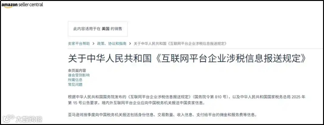 2025年10月,亚马逊宣布将按照中国税务机关的要求,向官方报送中国卖家的涉税信息,包括身份信息、交易数量、收入信息、支付给平台的佣金和服务费等信息。