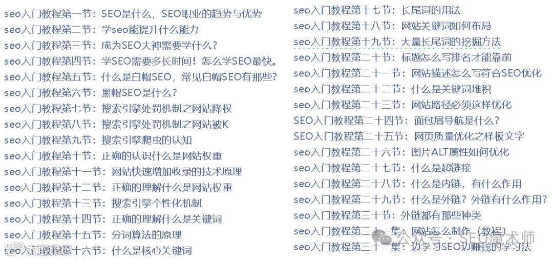 这份资料教程针对想要了解谷歌 SEO 的小伙伴,如果你想要了解谷歌 SEO ,但是自己是零基础/小白那么可以通过这份 12 节视频教程来步入谷歌 SEO 的路程上。