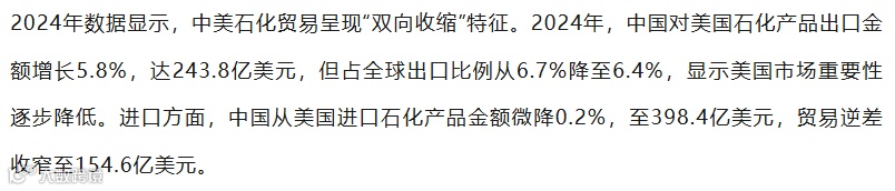 作为全球第一化工大国,中国已构建起覆盖油气勘探、炼化加工到精细化工的全产业链体系。此次关税战对年营收16.3万亿元的石化行业影响几何?数据显示,2024年中美石化贸易已呈现“双向收缩”特征:我国对美石化产品出口额243.8亿美元,占全球出口比例由6.7%降至6.4%;自美进口额微降0.2%至398.4亿美元,贸易逆差收窄至154.6亿美元。