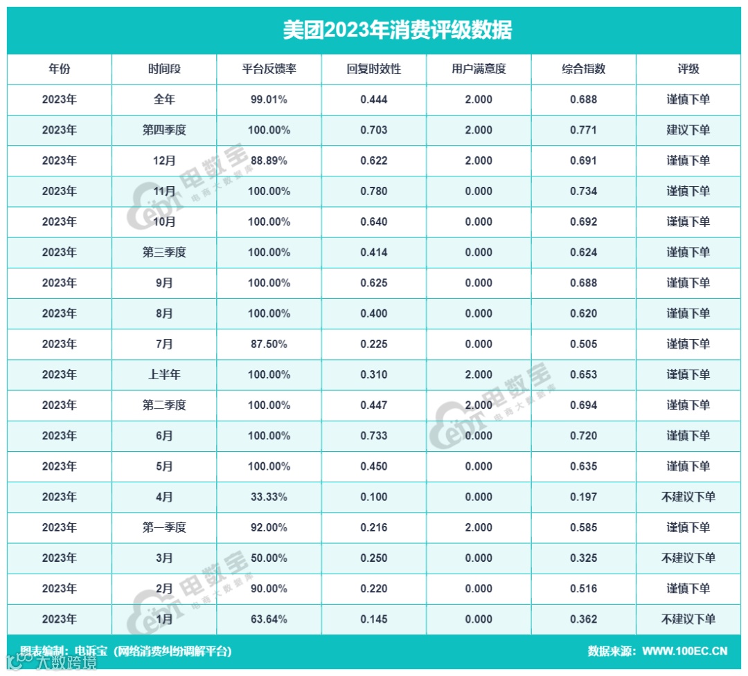 据网经社旗下电商大数据库“电数宝”监测数据显示,2023年“美团”共获得18次消费评级,14次为“谨慎下单”,3次为“不建议下单”,1次获“建议下单”评级,2023年一年整体消费评级为“谨慎下单”评级。