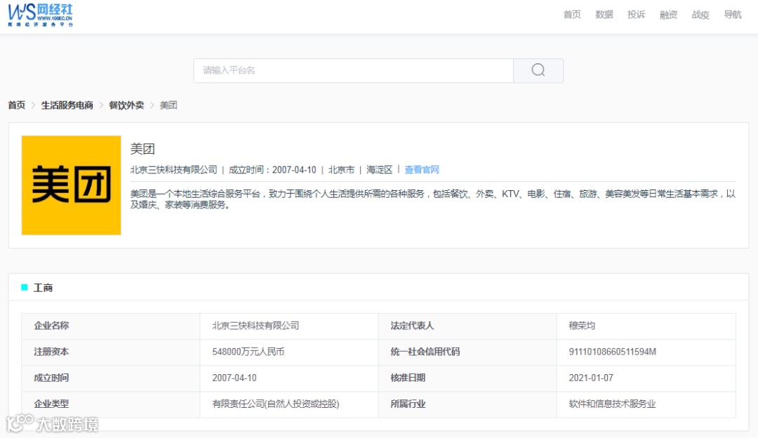 从网经社企业库(COP.100EC.CN)了解,美团隶属于“北京三快在线科技有限公司”,该公司成立于2007年4月10日,法定代表人穆荣均。美团作为自称中国领先的生活服务电子商务平台,美团公司拥有美团、大众点评、美团外卖、美团打车、摩拜单车等消费者熟知的App,服务涵盖餐饮、外卖、打车、共享单车、酒店旅游、电影、休闲娱乐等200多个品类,业务覆盖全国2800个县区市。