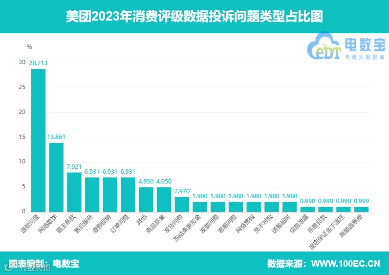 根据网经社旗下电商大数据库“电数宝”(DATA.100EC.CN)显示,“美团”涉嫌存在退款问题、网络欺诈、霸王条款、售后服务、虚假促销、的大舞台、商品质量、发货问题、冻结商家资金、发票问题、客服问题、网络售假、货不对板、送餐超时、信息泄露、恶意罚款、退店保证金不退还、高额退票费等问题。