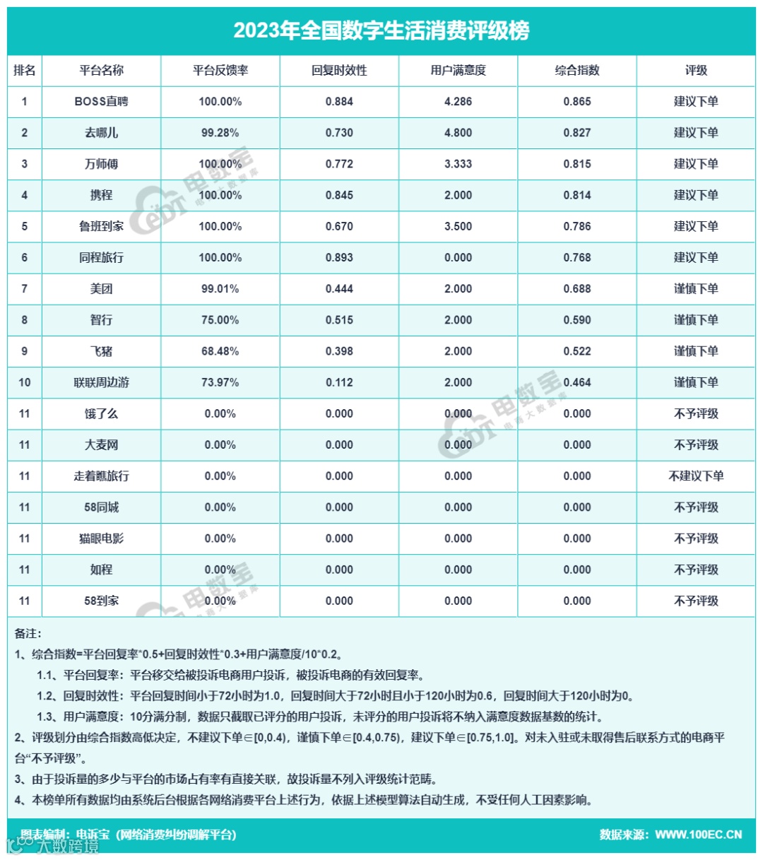 在“2023年全国数字生活消费评级榜”中,Boss直聘、去哪儿、万师傅、携程、鲁班到家、同程旅行等获“建议下单”评级;美团、智行、飞猪、联联周边游获“谨慎下单”评级;饿了么、大麦网、58同城、猫眼电影、如程、58到家等获“不予评价”;走着瞧旅行获“不建议下单”评价。