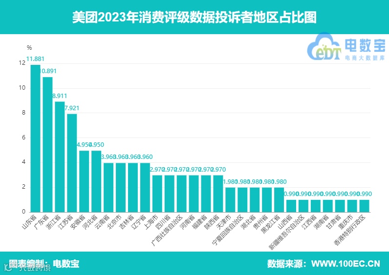 根据网经社旗下电商大数据库“电数宝”显示,2023年投诉“美团”的用户主要集中地区为山东省(11.881%)、广东省(10.891%)、浙江省(8.911%),其于分别为:江苏省、安徽省、河北省、云南省、北京市、吉林省、辽宁省、上海市、四川省、广西壮族自治区、河南省、福建省、陕西省、天津市、宁夏回族自治区、湖北省、贵州省、新疆维吾尔自治区、江西省、湖南省、甘肃省、重庆市、香港特别行政区。