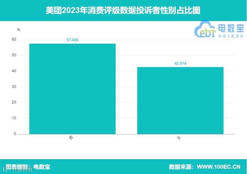 根据网经社旗下电商大数据库“电数宝”显示,投诉“美团”男性用户投诉比例为57.426%,女性用户投诉比例为42.574%。