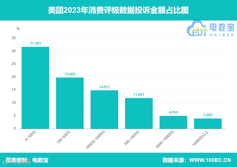根据网经社旗下电商大数据库“电数宝”显示,用户投诉“美团”的消费金额主要在0-100元、100-500元、1000-5000元、500-1000元、5000-10000元、10000元以上区间。