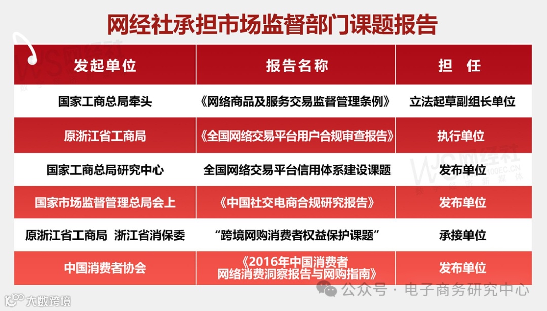 网经社在消费维权、立法等方面也取得不少成果,并得到有关部委、消协的肯定。如2020年网经社出席国家市监督总结在京召开的“互联网企业创建无传销网络平台座谈会”,发布国内首份《中国社交电商合规研究报告》;2017年承接浙江省工商局、浙江省消保委委托的“跨境网购消费者权益保护课题”;2016年承担承接国家工商总局和浙江省工商局“全国网络交易平台合规审查”调研课题项目;在国家工商行政管理总局消费者权益保护局、中国消费者协会指导,与《中国消费者报》举办的“促进电商发展指导网络消费”座谈会上,发布《2016年中国消费者网络消费洞察报告与网购指南》。