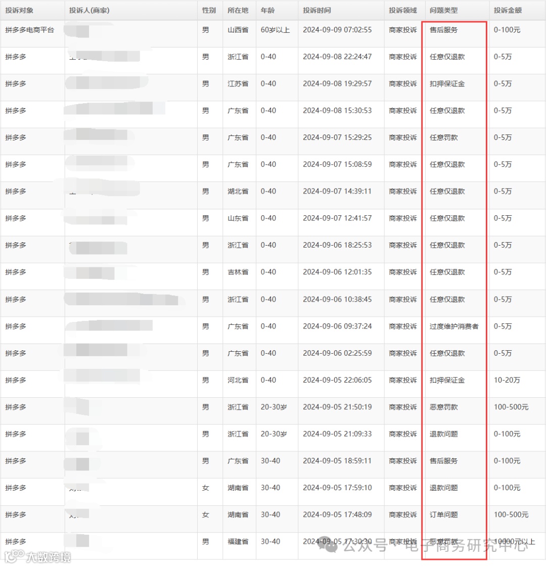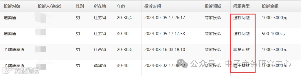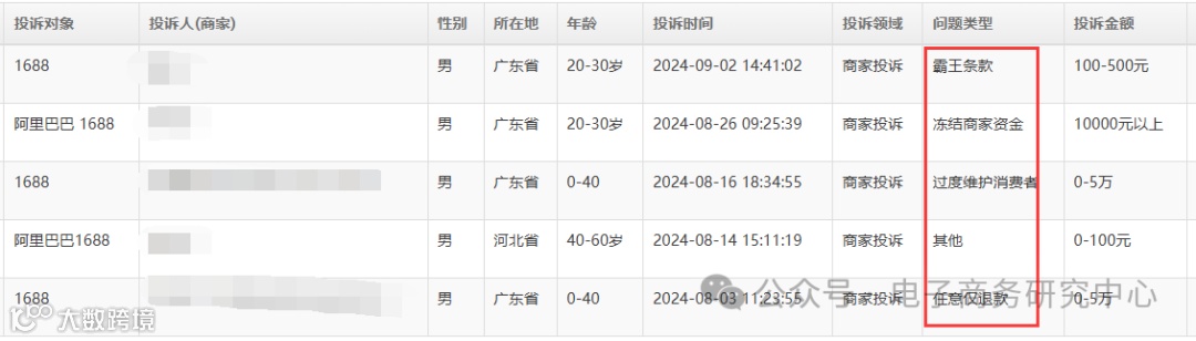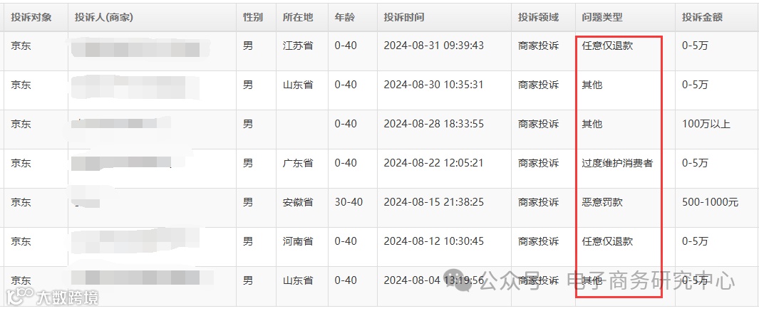 在此基础上,再结合公开信息,我们公布了电商平台“仅退款”十大案例,包括:速卖通、淘宝、拼多多、1688、快手、抖音、京东、小红书、TEMU、亚马逊。后期将发布《2024年暑期中国电子商务商家投诉数据报告》,敬请期待。