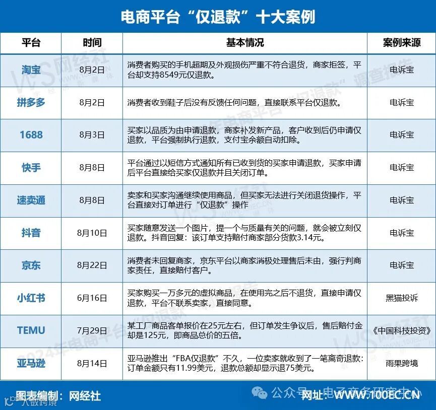 7月23日,全国知名网络消费纠纷调解平台“电诉宝”联合网经社电子商务研究中心发起“电商平台‘仅退款’调查行动”,涉及对象包括但不限于拼多多、京东、淘宝天猫、抖音电商、快手电商、1688、小红书等国内电商平台,并密切关注速卖通、Temu、亚马逊、SHEIN等跨境电商平台。
