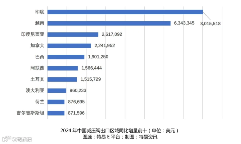 同时,区域需求差异明显。美国依旧在安全阀和阀门零件领域保持领先份额,但在油压阀领域已被俄罗斯取代。新兴市场中,印度减压阀需求增长17.6%,越南止回阀增量占全球23.1%,这些细分市场的快速放量正在改变全球阀门贸易格局。