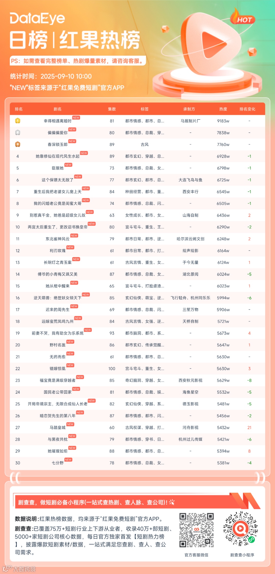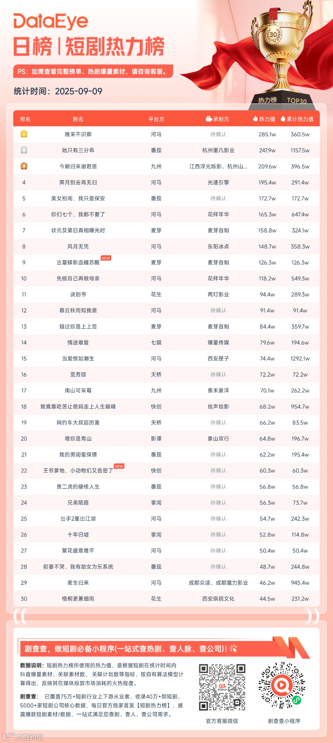 9月10日,DataEye微短剧热力榜、红果热榜、抖音动态漫榜、端原生热播榜4大榜单合集如下。