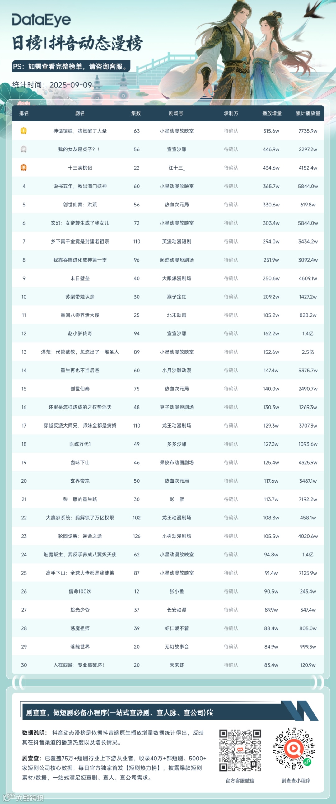 DataEye抖音动态漫榜,小星动漫放映室《神话镇魂,我觉醒了大圣》第一,本期播放增量达515.6W;宣宣沙雕播放的微恐题材漫剧《我的女友是贞子?!》第二,播放增量达446.9W;江十三《十三卖桃记》位列第三,播放增量达434.6W。