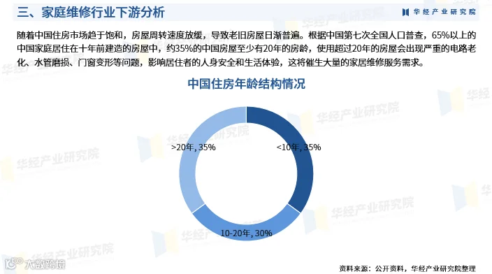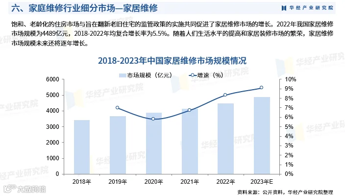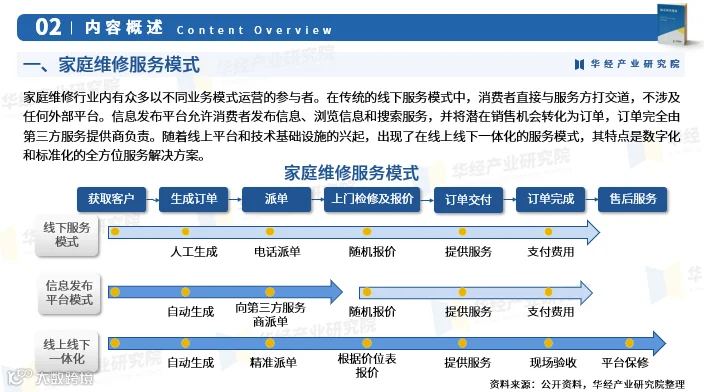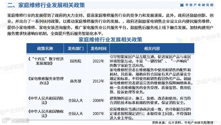 家庭维修涵盖家电维修、管道疏通、防水补漏、墙面翻新、家具门窗及水电维修等多个领域,服务模式正从传统线下逐步转向线上线下一体化的数字化、标准化综合解决方案。 随着居民生活水平提升和家用电器普及,家庭维修需求显著增长。数据显示,2022年我国家庭维修市场规模达6695亿元,2018-2022年均复合增长率为6.2%,预计2023年将增至7297亿元;同期家居维修市场规模为4489亿元,复合增长率5.5%。 行业竞争激烈,主要参与者包括海尔、美的等品牌企业以及啄木鸟维修等专业平台。其中,啄木鸟维修凭借多年行业积累,已成为国内最大的家庭维修服务平台,并引领行业数字化转型进程。企业普遍通过提升服务质量、加强技术革新与人才培养来构建核心竞争力。 华经产业研究院研究团队采用SCP模型、SWOT、PEST、回归分析等方法,全面剖析家庭维修行业的市场容量、产业链结构、盈利模式、政策环境、技术趋势及竞争格局,系统评估行业发展机遇与风险。 基于对行业轨迹与实践经验的深入研究,团队编制《2025-2031年中国家庭维修行业发展前景预测及投资方向研究报告》,为企事业单位、科研机构及投资方提供战略规划、产业研究与投资决策的重要参考。 该报告内容覆盖行业定义、商业模式、风险壁垒、宏观经济与政策环境、全球发展动态、中国市场供需状况、区域市场分析、上下游产业链及重点企业经营情况,并对未来六年的发展趋势进行专业预判。 报告数据来源兼顾一手调研与二手资料,经过严格清洗、筛选与综合测算,确保研究成果的科学性与权威性。