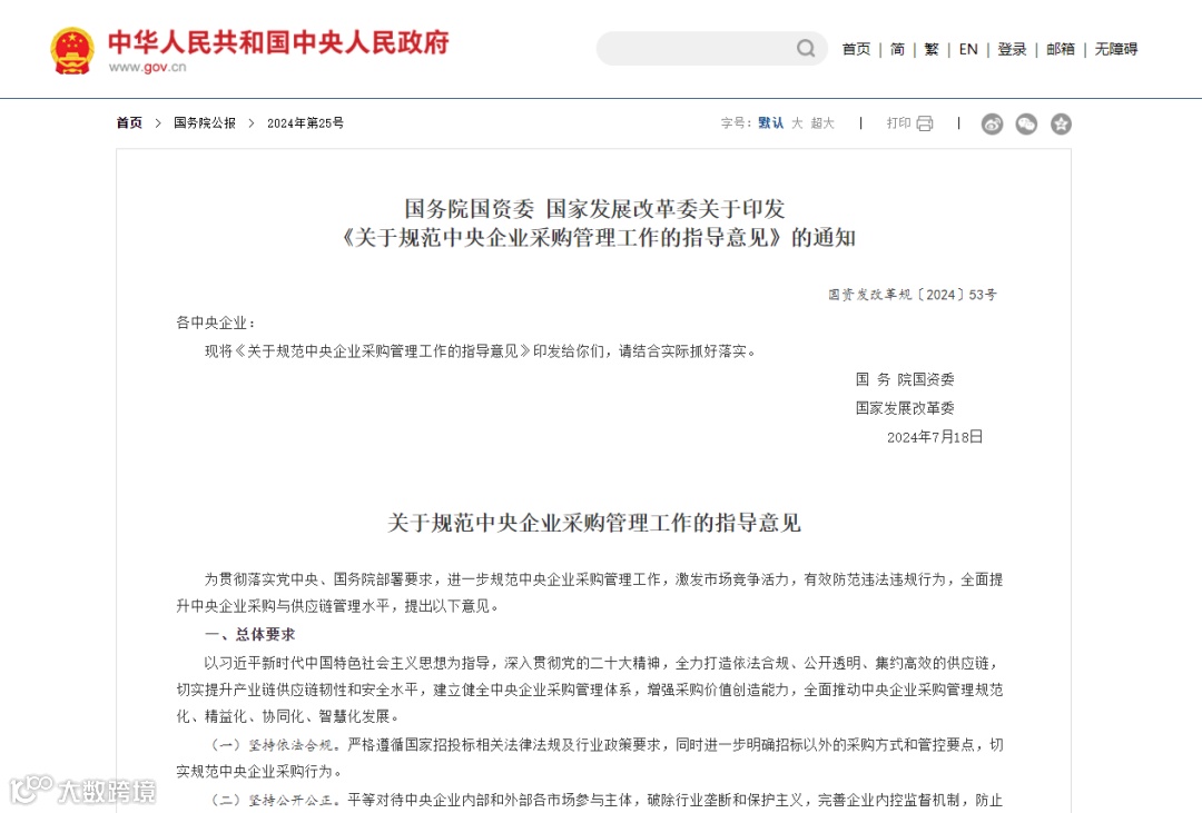 而去年发布的《关于规范中央企业采购管理工作的指导意见》,指导意见围绕合理选择采购方式、强化采购寻源和供应商管理、完善采购执行和评审机制、推动采购活动公开透明、提升采购数智化水平、加大集中采购力度、发挥采购对科技创新的支撑作用、鼓励更好履行社会责任等方面,提出一系列具体要求。