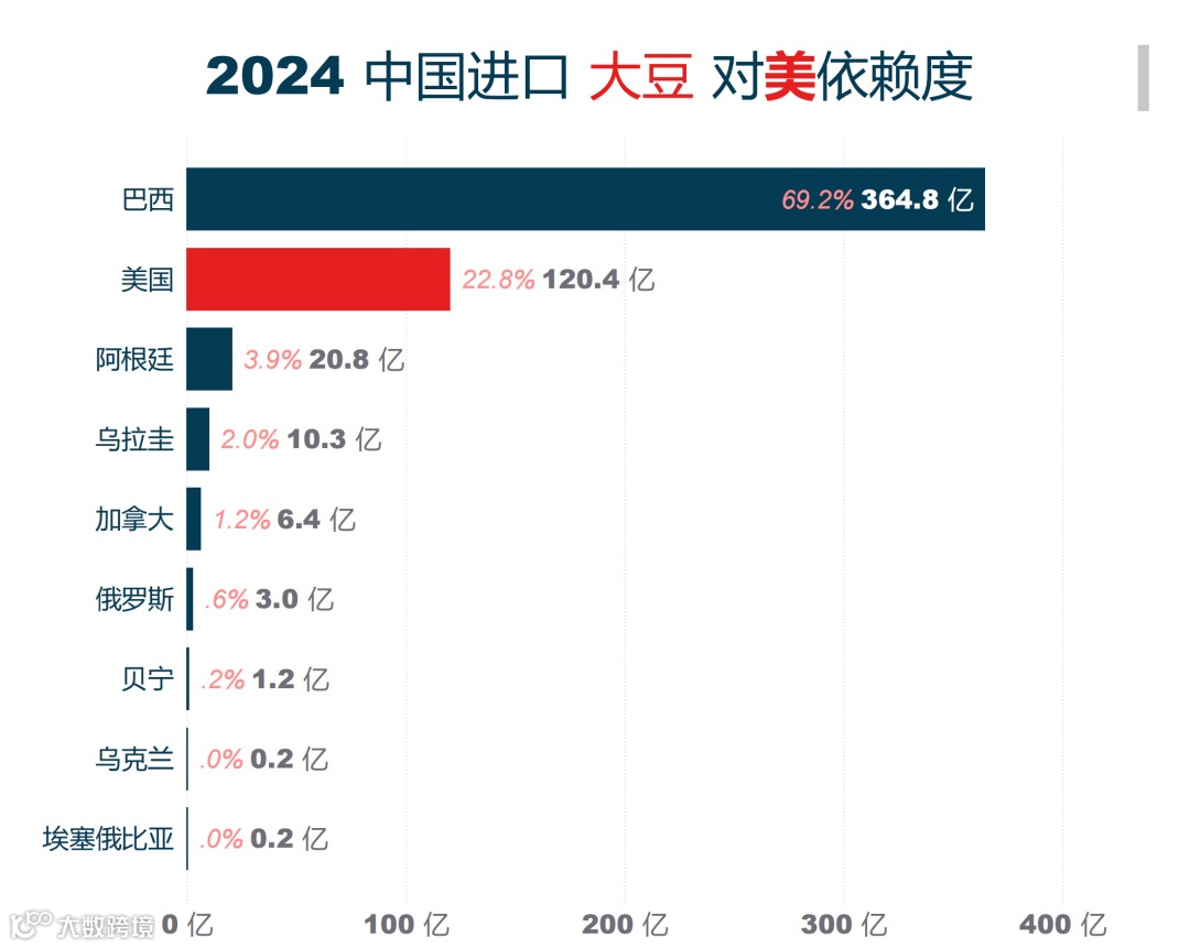 美国为全球第二大大豆出口国(第一为巴西),中国从美国进口大量大豆。2024年,从美国进口的大豆占当年中国全球大豆进口总额的22.8%。