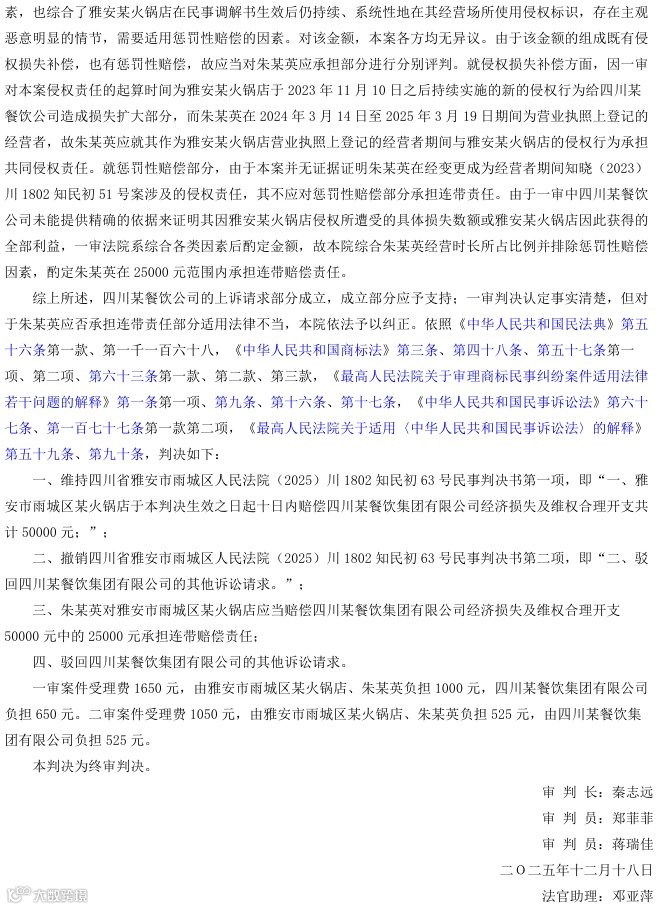 2025年12月18日,四川省雅安市中级人民法院就一起侵害商标权纠纷案作出终审判决:雅安市雨城区某火锅店在经营中持续使用与注册商标“小某坎”相同或高度近似的标识,构成商标侵权;朱某英作为该店2024年3月14日至2025年3月19日期间的登记经营者,依法推定为责任主体,应就该期间内产生的侵权损害承担连带赔偿责任,酌定金额为25000元。