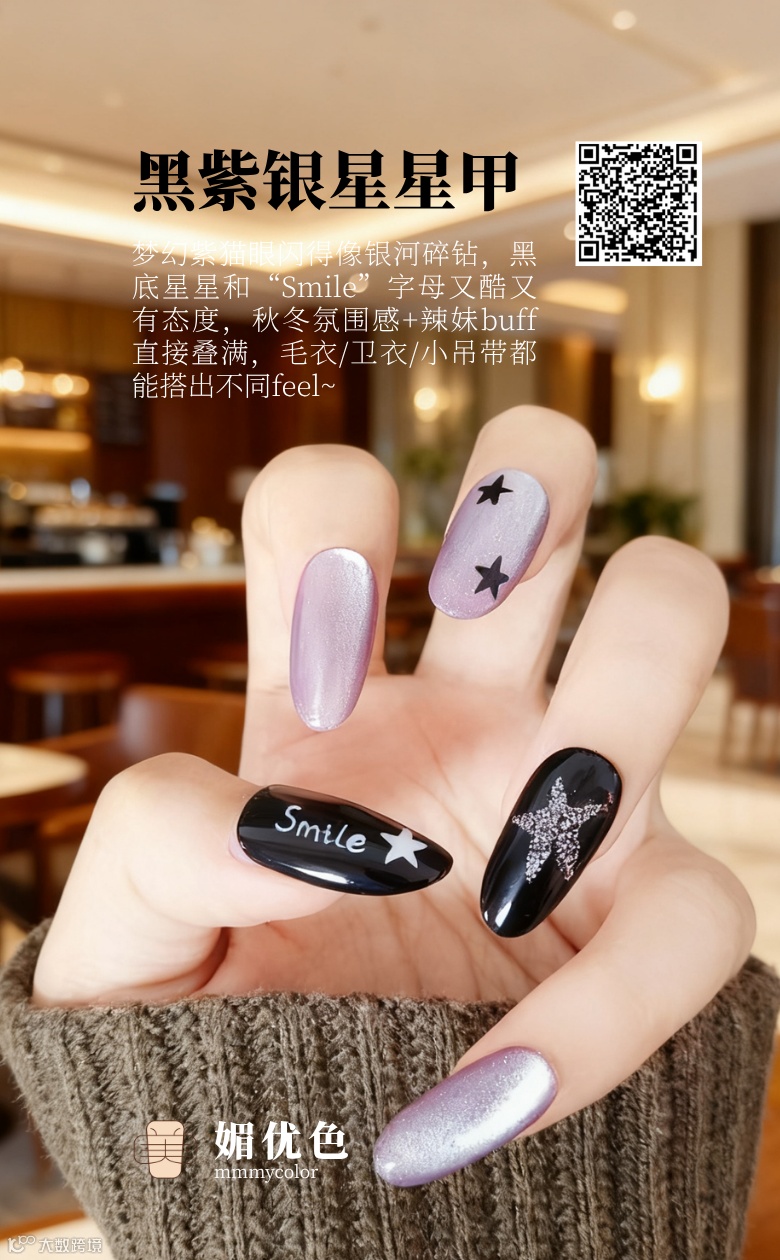 别家甜妹甲太寡淡,酷飒款又显凶?这款黑紫银星星甲直接焊死 “甜酷结界”!梦幻紫猫眼碎钻似银河倾泻,黑底星星 + Smile 字母拽姐感拉满,秋冬搭毛衣甜、配吊带辣,风格切换无压力。别家单调配色 vs 它的层次碰撞,别家普通装饰 vs 它的细节杀,谁赢谁输一目了然,美甲荒的姐妹闭眼冲就完事儿!