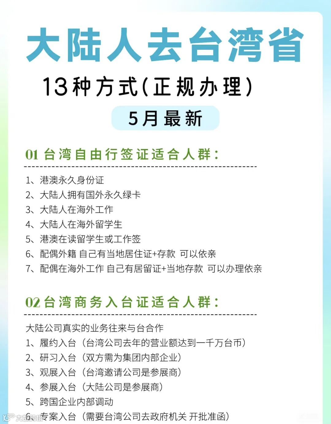 本文梳理台湾入台的13种正规签证类型,涵盖自由行与商务两大类别,帮助有赴台需求的人员快速了解适用自身情况的入台途径。