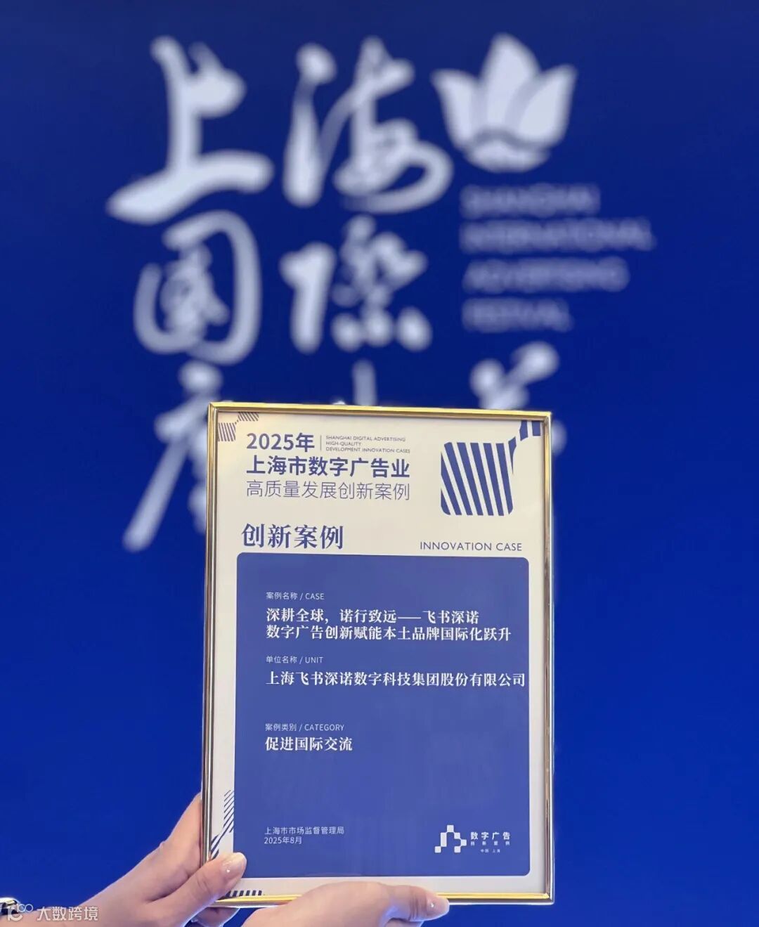 9月9日,2025年上海国际广告节正式开幕。飞书深诺集团荣膺“2025年上海市数字广告业高质量发展创新案例”,并获上海市广告协会授予的数字广告证明商标,成为一级数字广告企业。两项权威认可,充分体现了其在数字营销领域的领先实力,也折射出上海广告业数字化转型的显著成果。