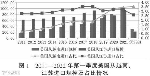 自2020年起,美国从越南进口规模及份额已超过江苏,显示出明显的出口替代趋势(图1)。尤其是在疫情后,越南复工复产加快,进一步压缩江苏出口空间。