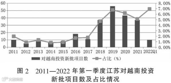 2017年以来,江苏对越南投资显著增加(图2)。尽管受疫情影响,2022年第一季度江苏对越南投资再次回升,新批项目数占比达6.94%,中方协议投资额同比增长138.99%。