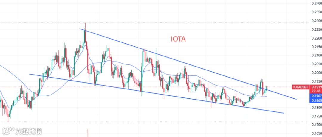 IOTA:4小时级别突破下降楔形,站稳9日与50日均线,成交量放大。若保持在0.186支撑之上,有望测试0.200–0.205,进一步挑战0.215。
