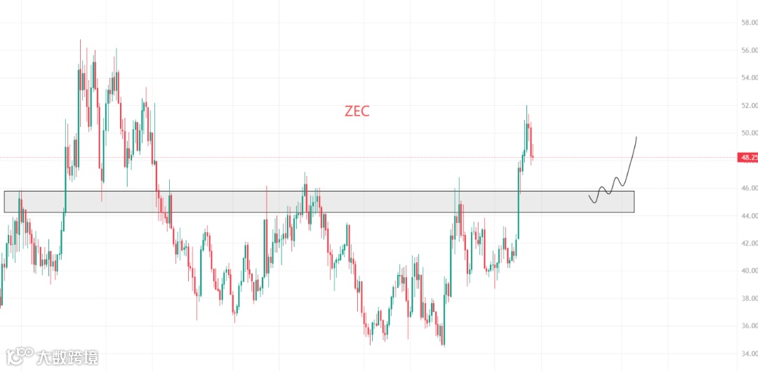 ZEC:出现潜在反转区域,突破主要阻力后回踩,若确认支撑有效,有望重启升势,建议耐心观察。