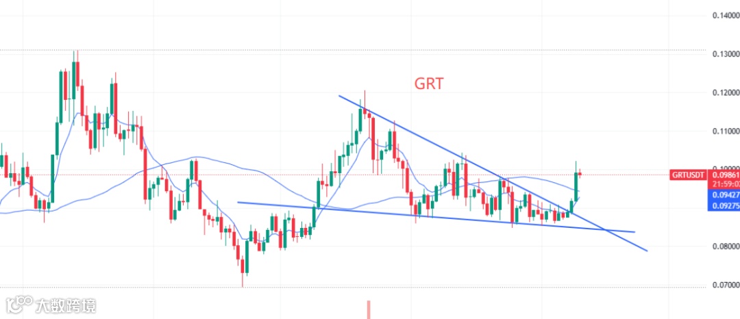 GRT:日线级别确认下降楔形突破,放量收复短期均线。若成功突破0.100–0.105阻力区,有望上探0.115–0.120,只要守住0.092关键支撑,整体走势维持看涨。
