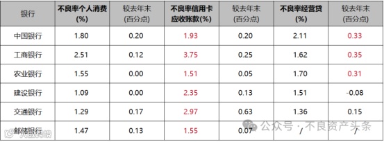 国有六大行信用卡不良率无一例外全部上涨: 工商银行达3.75%,交通银行达2.97%。消费贷、经营贷不良率也多呈上行趋势。