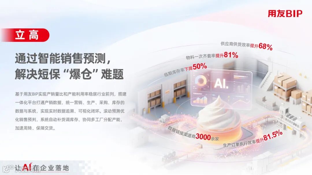 依托 “AI×数据×流程” 原生一体化架构,用友BIP以场景化小模型AI应用为核心,精准定位需求,驱动产销协同,实现面向客户的精准运营。其小模型深度适配业务场景,比如在销售端通过多维数据智能分析,生成精准销量预判,助力库存优化与资金高效周转;供应链领域构建协同体系,凭借快速数据处理与情景模拟能力,动态优化生产、采购及交付计划。