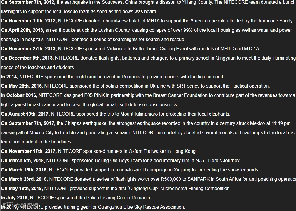 随着欧盟和北美各国发布政策,规定企业需定期披露ESG相关内容;加上社会各界对品牌能否做到环境友好与承担相关责任的关注更是日益俱进。若以ESG为判断准则,Nitecore表示毫无压力。2012-2020年间,Nitecore向多个地区的突发灾害和公益组织提供资助。8年里,Nitecore通过坚持不断的公益行为帮品牌提高附加值。